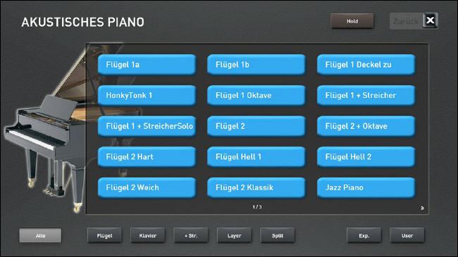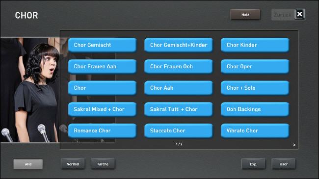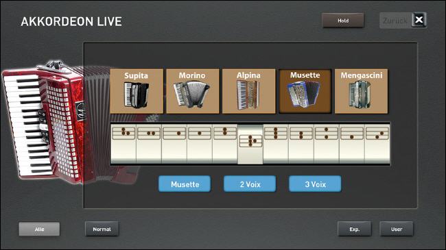Sobald Sie Akkordeon-Live wählen, erscheint im Display eine Original Akkordeon-Registerleiste. Schalten Sie von einem Register auf das andere um, hören Sie auch das Original Umschaltklicken. Und dann die unglaublichen Sounds, es sind alle gängigen Akkordeon-Sounds zu finden. Echte sonore Hohner Morino-Klänge, der schöne Doppeloktave-Klang (4 Fuss mit 16 Fuss) oder das berühmte französische Musetteakkordeon, bei dem die einzelnen Chöre gegeneinander leicht verstimmt sind und somit den lebendig schwebenden Musette-Ton hervorbringen. Damit lassen sich sehr effektvoll französische Akkordeon-Chansons spielen oder die weltbekannten steirischen Knopfakkordeon-Sounds. Nicht nur Akkordeonspieler werden von dieser Soundbank begeistert sein.