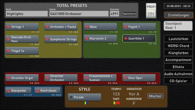 Nach dem Einschalten des Instruments werden Ihnen nur die wichtigsten Bedienelemente angezeigt. Und zwar alles so, wie es auf dem Instrument auch zu finden ist. Oben zuerst die Total Preset, mit denen Sie alles mit einem Tastendruck verändern können. Dann das obere Manual, darunter das untere Manual und ganz unten Bass und Begleitung.