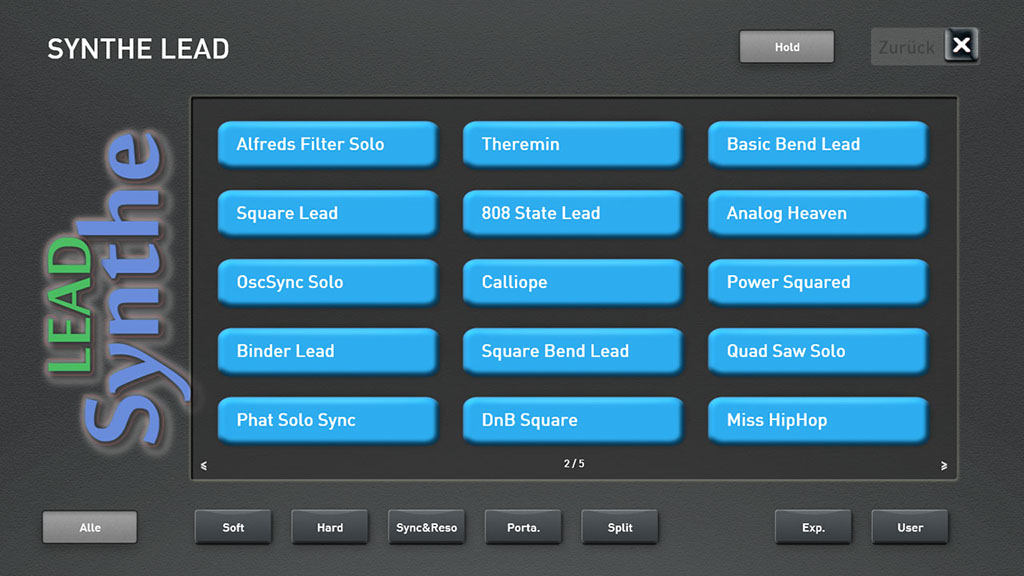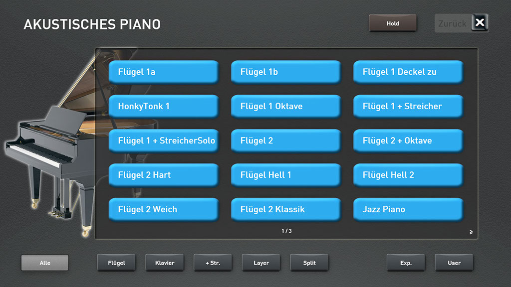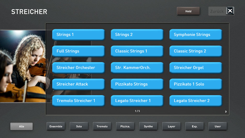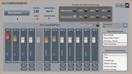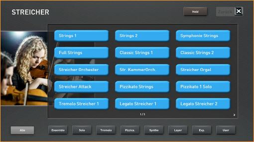 Sobald Sie Akkordeon-Live wählen, erscheint im Display eine Original Akkordeon-Registerleiste. Schalten Sie von einem Register auf das andere um, hören Sie auch das Original Umschaltklicken. Und dann die unglaublichen Sounds, es sind alle gängigen Akkordeon-Sounds zu finden. Echte sonore Hohner Morino-Klänge, der schöne Doppeloktave-Klang (4 Fuss mit 16 Fuss) oder das berühmte französische Musetteakkordeon, bei dem die einzelnen Chöre gegeneinander leicht verstimmt sind und somit den lebendig schwebenden Musette-Ton hervorbringen. Damit lassen sich sehr effektvoll französische Akkordeon-Chansons spielen oder die weltbekannten steirischen Knopfakkordeon-Sounds. Nicht nur Akkordeonspieler werden von dieser Soundbank begeistert sein.