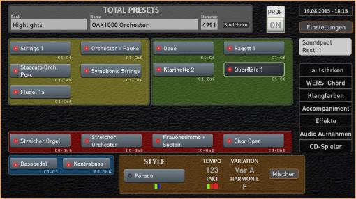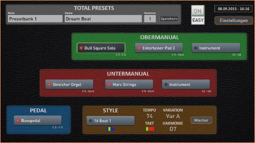 Nach dem Einschalten des Instruments werden Ihnen nur die wichtigsten Bedienelemente angezeigt. Und zwar alles so, wie es auf dem Instrument auch zu finden ist. Oben zuerst die Total Preset, mit denen Sie alles mit einem Tastendruck verändern können. Dann das obere Manual, darunter das untere Manual und ganz unten Bass und Begleitung.