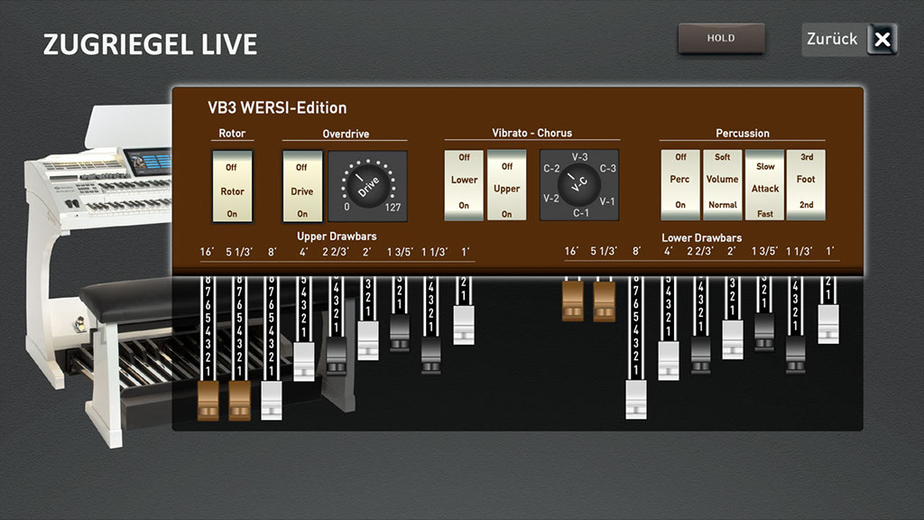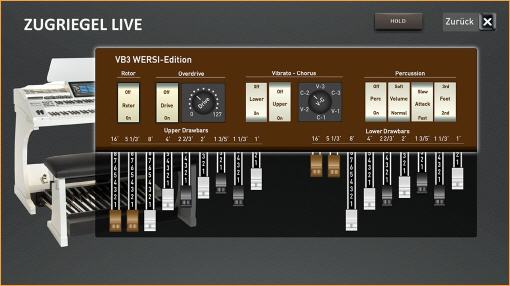 Zugegeben, nichts greift sich schöner als die Zugriegel einer alten elektromechanischen Orgel. Dieses schwere "satte" Gefühl beim Herausziehen, das begeistert einfach jeden Orgelfan. Aber die WERSI Zugriegel sind ganz nahe dran. Auch sie greifen sich einfach wundervoll. Und dann der Zugriegelklang, ja es ist der Sound der alten mechanischen Soundräder. Ziehen Sie einen Zugriegel nach dem anderen heraus und dann schalten Sie den Rotor auf Slow oder Fast - der Sound haut Sie vom Hocker oder besser - von der Orgelbank.