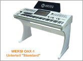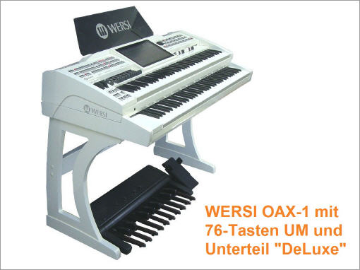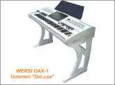 Ab sofort stehen das 76-Tasten Zusatzmanual sowie die brandneuen Holz-Unterteile für das WERSI SONIC OAX-1 Keyboard zur Verfügung. Das OAX-1 kann entweder direkt auf das Unterteil "Standard" oder auf das Unterteil "DeLuxe" gestellt werden. Wird das 76-Tasten Zusatzmanual verwendet, so wird zuerst das Zusatzmanual mit dem entsprechenden Holz-Unterteil verbunden und dann das OAX-1 Keyboard einfach auf das Zusatzmanual aufgesetzt.